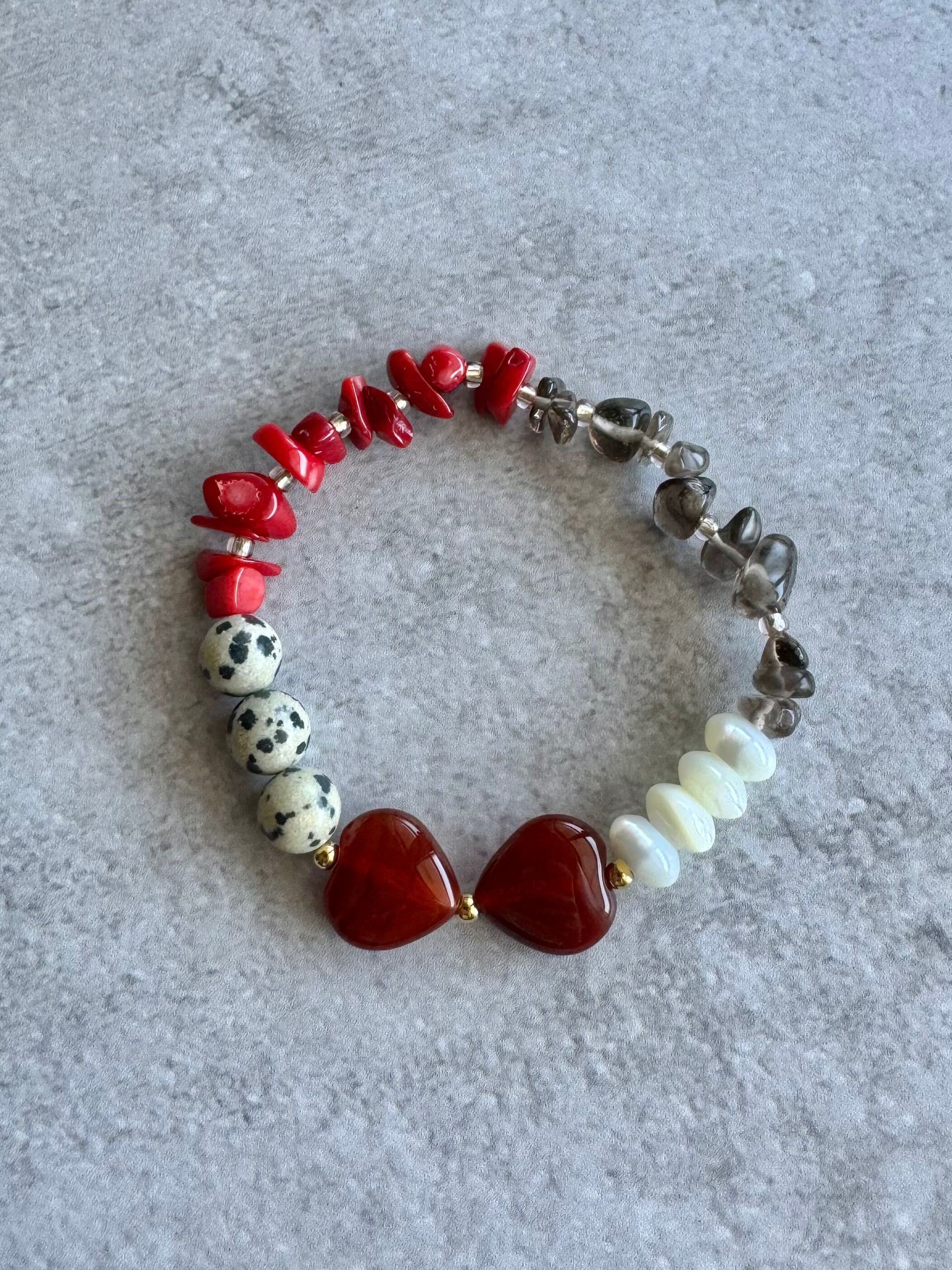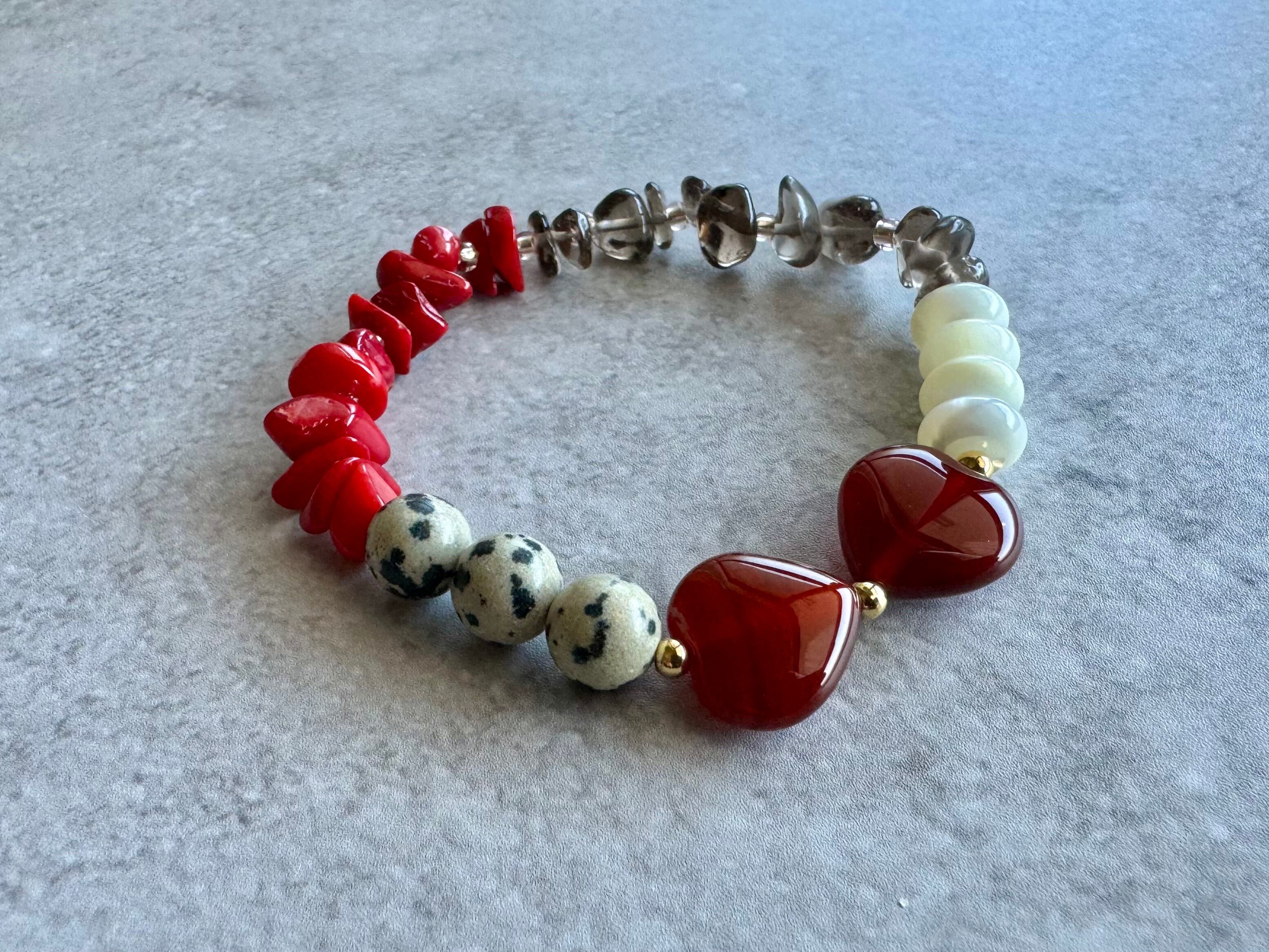 【送料無料】レッドコーラル✖️スモーキークォーツ✖️ダルメシアンジャスパー✖️レッドアゲート✖️マザーオブパールのブレスレット