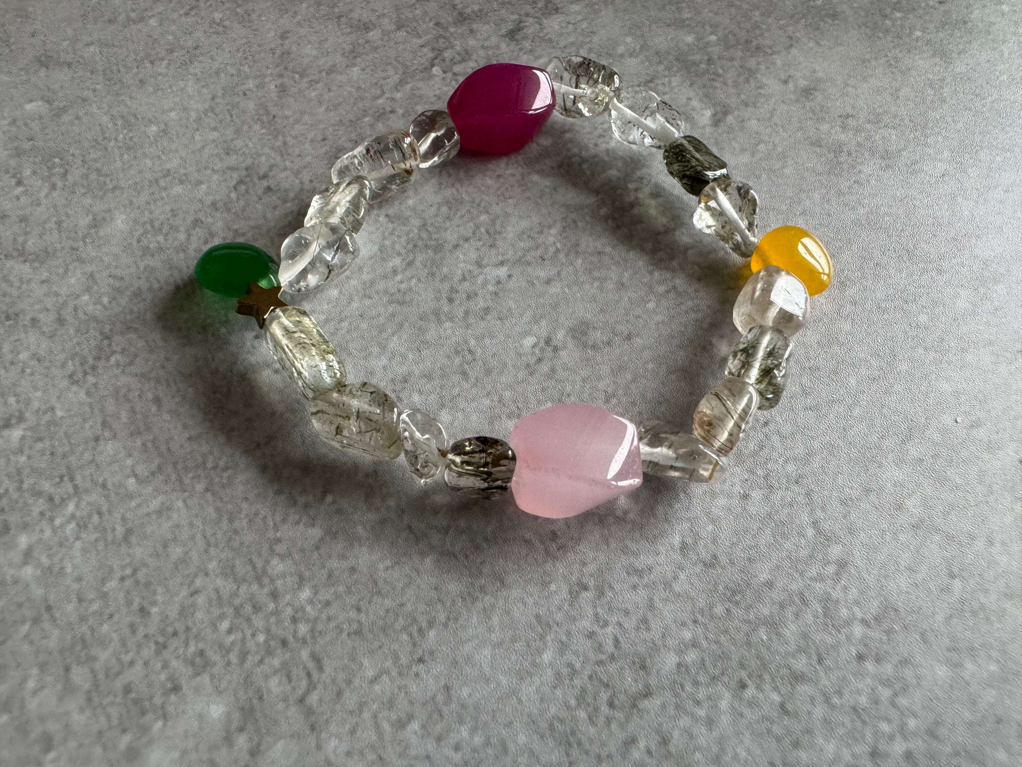 《グリーンマイカインクォーツ✖️ワインレッドジェイド✖️ライトピンクジェイド✖️ハニーカラージェイド✖️グリーンジェイド✖️ヘマタイト(星型)》
